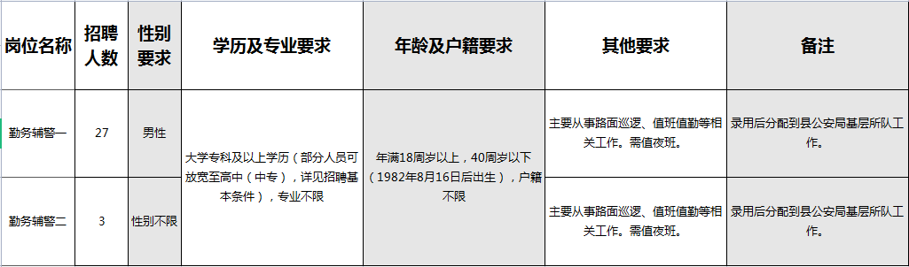 二、招聘基本条件(一)具有中华人民共和国国籍。(二)拥护中国共产党领导,拥护中华人民共和国宪法,遵守国家法律法规,品行端正。(三)户籍不限。(四)具有大专以上文化程度和履行岗位职责所需的工作能力。部分岗位需适应夜班。(五)下列人员应聘辅警的,其学历可以放宽至高中(中专):1.烈士遗属,因公牺牲的军人、人民警察、辅警的遗属,病故军人遗属;2.退役军人;3.国家综合性消防救援队伍转退的救援人员;4.见义勇为人员;5.国家和省规定的其他人