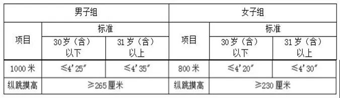 (二)体能测试体能测试参照《公安机关录用人民警察体能测评项目和标准(暂行)》开展,项目包括1000米(男)或800米长跑(女)、纵跳摸高两项。